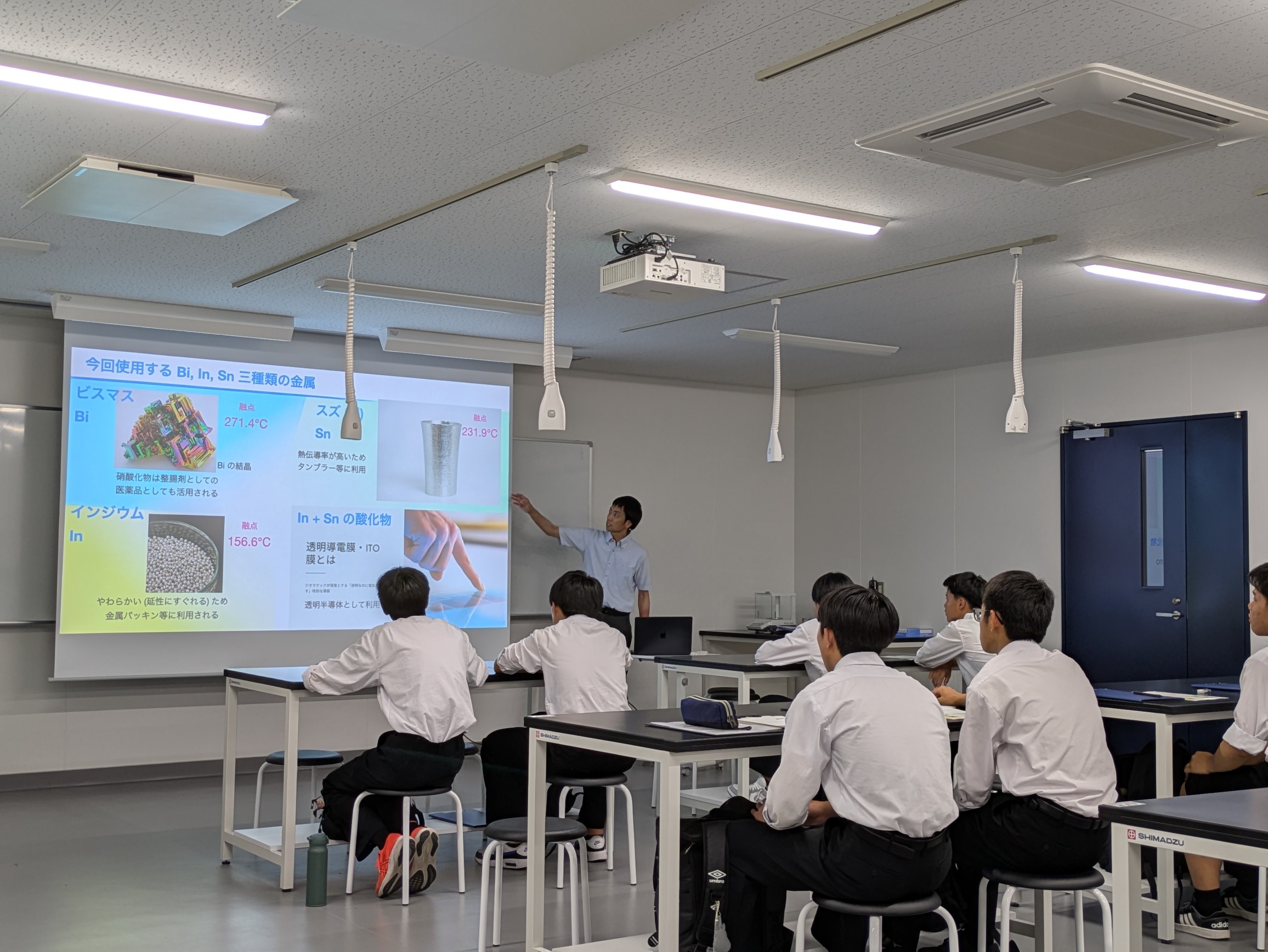午後からは森戸先生による模擬授業「日本刀の中身はどうなっている?」、榎木先生、藤﨑先生によるミニ実験「お湯で溶ける金属の不思議」を実施しました。