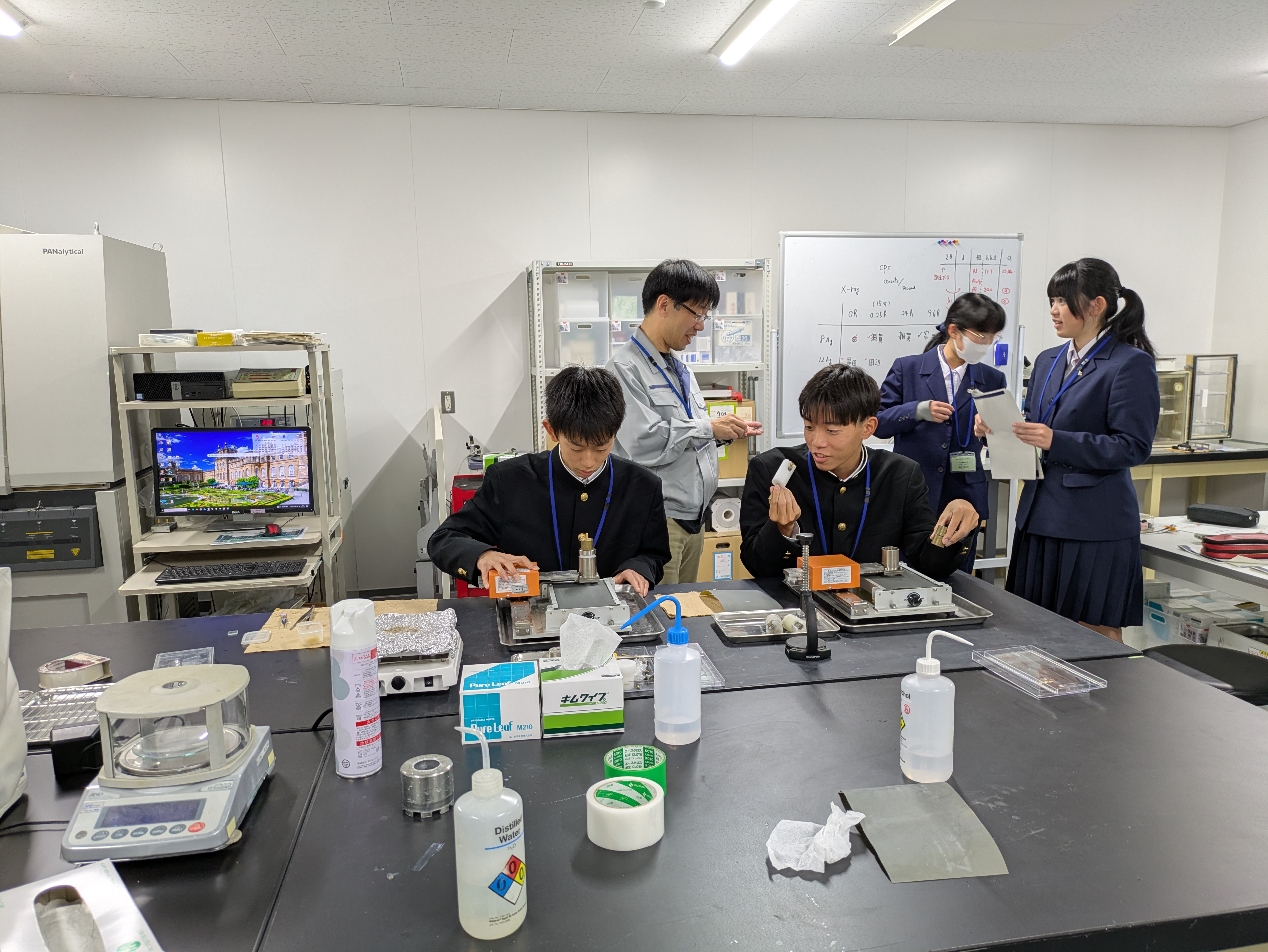 前回の実験の続きを行ったり、測定の様子を見学したりしながら、班に分かれて2時間の実験体験にも取り組みました。